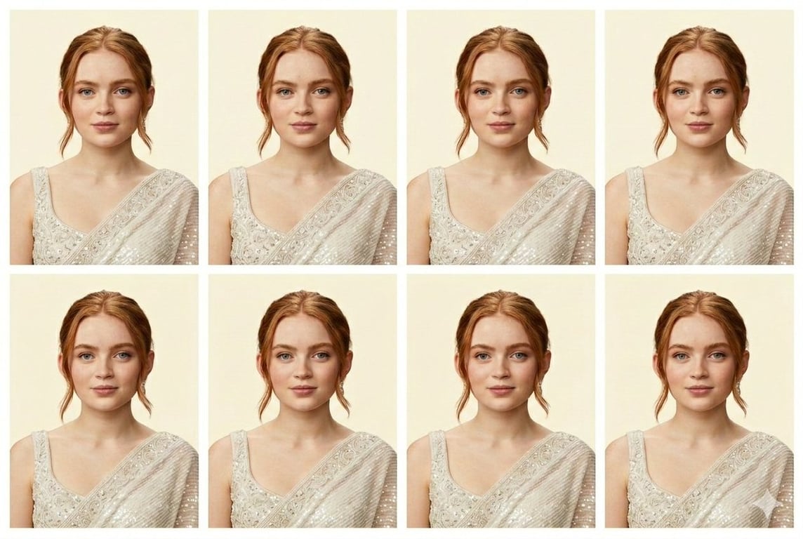 A structured JSON prompt designed to generate a grid of six identical, ultra-realistic passport-size photos based on an uploaded image, ensuring strict adherence to official standards for expression, lighting, background, and composition.