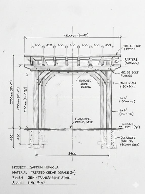 A dual prompt used to transform an architectural pencil sketch of a wooden pergola into a photorealistic image of the fully built structure in a garden. The prompt ensures the final image matches the exact structure and proportions of the hand-drawn blueprint.