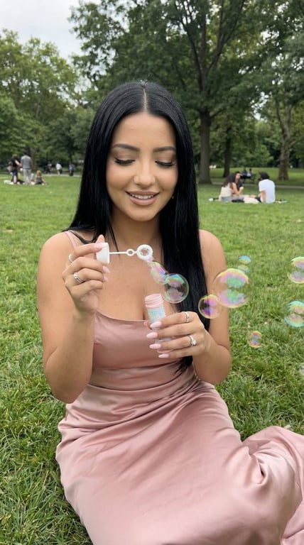 A highly detailed, structured JSON prompt for generating a photorealistic lifestyle portrait of a woman in a blush pink satin dress blowing iridescent soap bubbles in a lush green park setting, emphasizing soft lighting and realistic fabric texture.