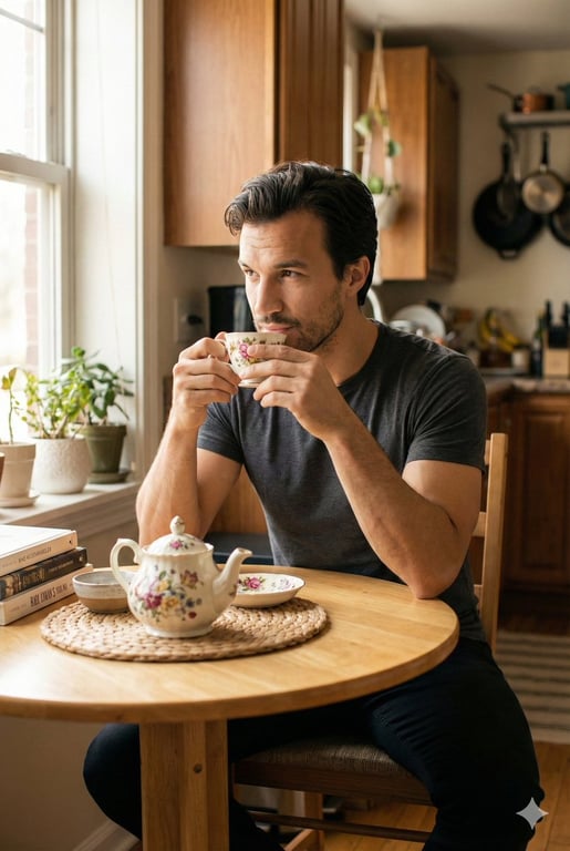 A highly structured JSON prompt designed to generate a photorealistic single image of a man sitting in a bright, cozy kitchen, holding a teacup. The prompt meticulously defines the render goal, subject details, scene elements, camera specifications (50mm cinematic lens), and lighting/color grading for a quiet, intimate morning moment.
