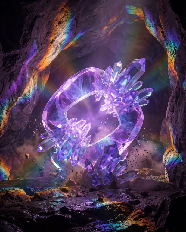 A prompt for generating a photorealistic image of a natural crystal formation, specifically designed to match the exact shape of a referenced image, emphasizing prismatic light refractions and an ethereal, alchemical aesthetic.