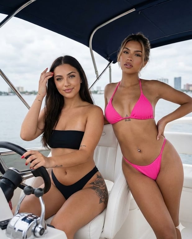 A highly detailed, structured prompt designed for generating a photorealistic, high-definition portrait image in the style of influencer photography. It specifies two female subjects, one seated in a captain's chair and one standing, detailing their demographics, facial features, hair, body details (including specific tattoos), attire (bikinis), and precise poses. The prompt also sets technical parameters like a 4:5 aspect ratio and soft natural daylight lighting.