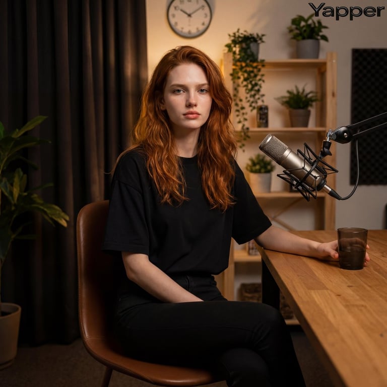 A detailed prompt for Nano Banana Pro to generate a photorealistic image of a person with long wavy hair, seated at a wooden table in a warm recording studio, maintaining the exact facial identity from a reference image, and focusing on soft, cozy lighting.