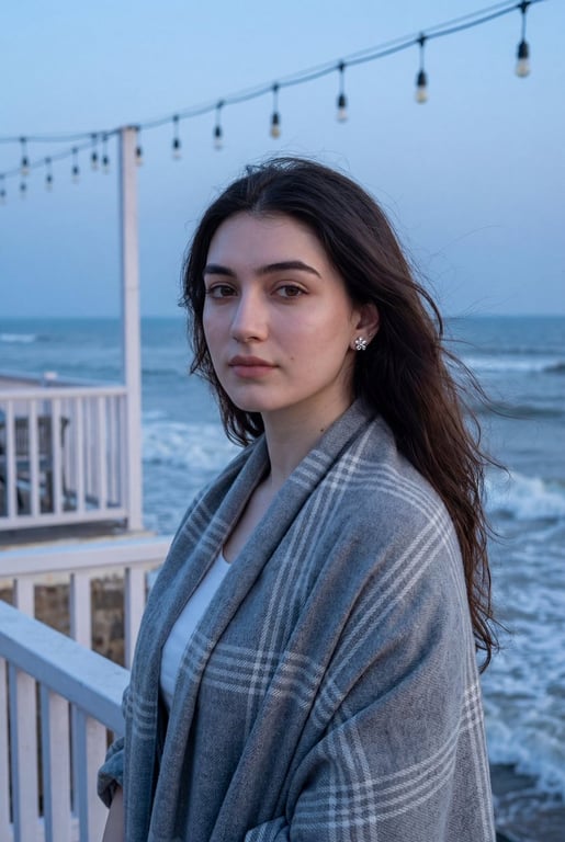 A detailed photorealistic prompt for generating a portrait of a young woman on a seaside terrace during blue hour, emphasizing cinematic coastal atmosphere, soft blue lighting, and high-detail skin texture using an 85mm lens simulation.