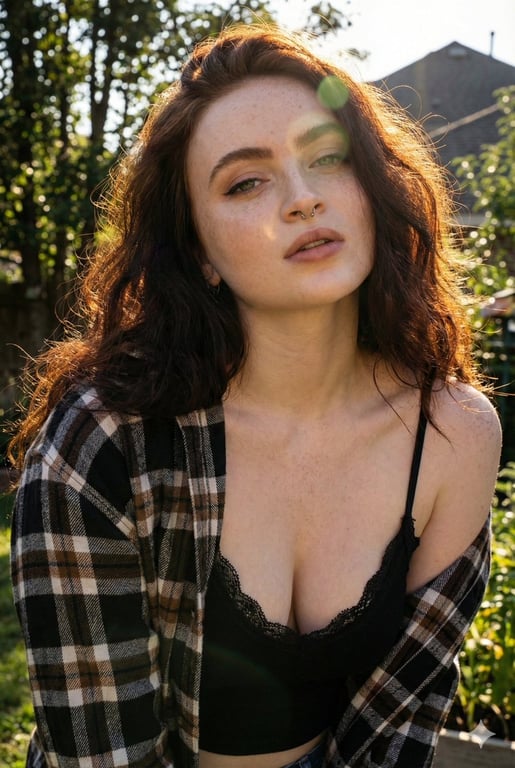 A highly detailed prompt for generating a photorealistic portrait of a young woman with voluminous, messy hair and prominent freckles. The prompt emphasizes specific lighting conditions (golden hour backlighting), technical specifications (4K Ultra HD, deep depth of field), and a casual grunge aesthetic.