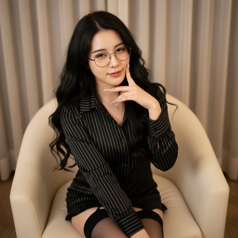 A highly specific prompt for generating a photorealistic portrait of a young Asian woman in a black pinstriped shirt dress and sheer thigh-high stockings. It details the pose, environment (sheer curtains), lighting (warm, soft indoor), and precise camera settings (focal length, aperture, shutter speed, ISO) to achieve a shallow depth of field and a polished, slightly candid aesthetic.