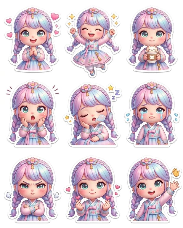 A detailed JSON prompt for Nano Banana 2 to generate a 3x3 grid of expressive, Pixar-style 3D chibi doll stickers, maintaining consistent identity across all panels, featuring pastel gradient hair and various outfits and emotions.