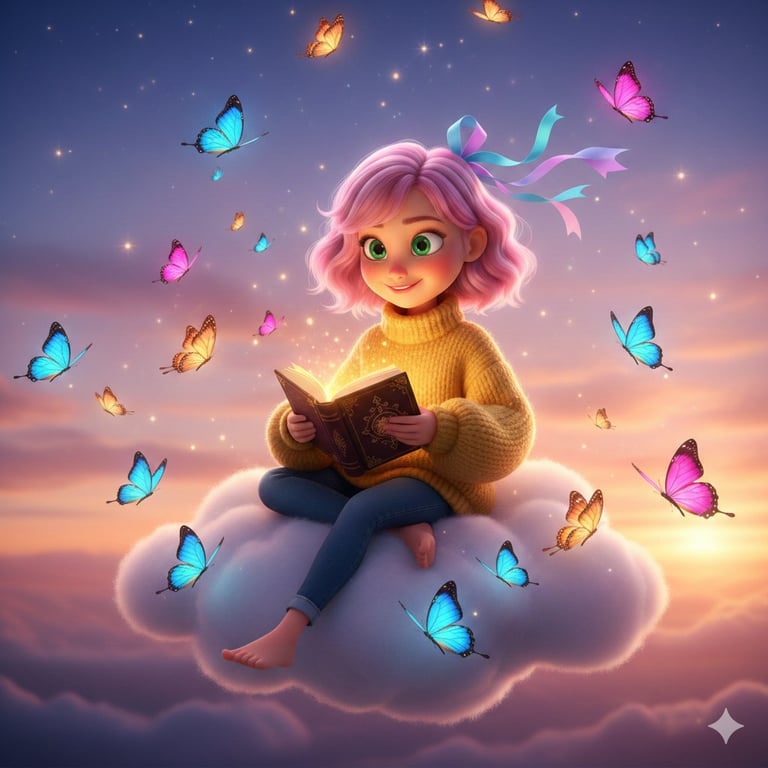 A detailed image generation prompt for Nano Banana Pro to create an ultra-photorealistic, Pixar-style 3D character of a girl with pink hair sitting relaxed on a giant soft cloud in a dreamy twilight sky, holding a glowing magical book, surrounded by glowing butterflies.
