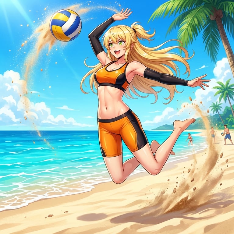 A prompt used with Nano Banana Pro to transform a subject into a beach volleyball player, emphasizing a powerful jump and spike under the sun.