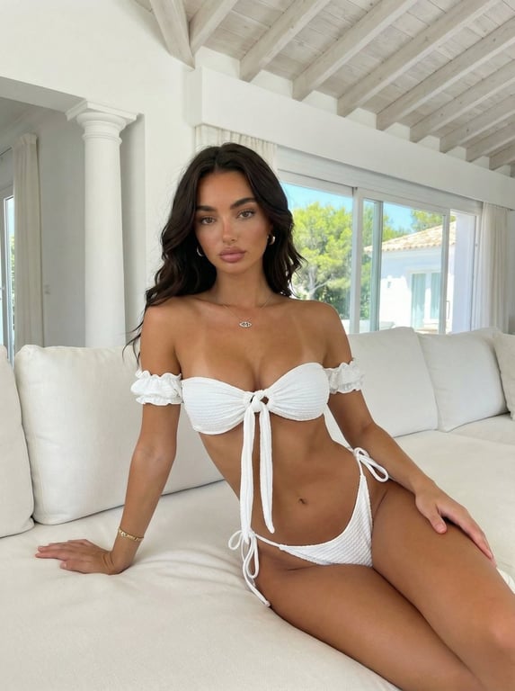 A highly detailed, structured JSON prompt for Nano Banana Pro designed to create a hyper-realistic photograph of an AI influencer. It specifies the subject's features, physique (emphasizing natural gravity and asymmetry of the chest), attire (two-piece textured bikini), pose, environment (Mediterranean summer villa), and technical camera/lighting settings for maximum realism.