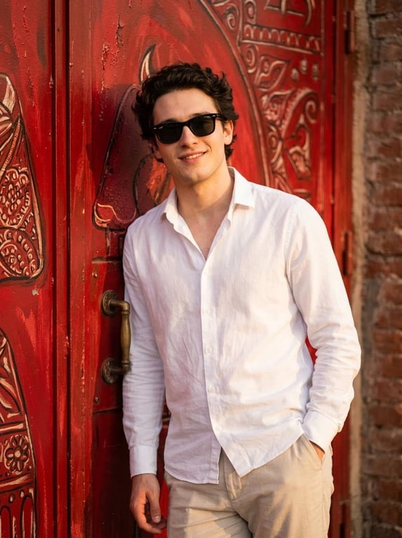 A prompt for Nano Banana 2 used on Google Gemini, instructing the model to create a realistic photo of a person using an uploaded face, standing in front of a red metal door with cinematic lighting and warm tones.
