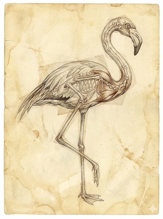 A concise prompt for generating an image in the style of a Renaissance anatomical study. It specifies the subject as a flamingo standing on one leg, rendered using fine graphite and ink cross-hatching, with transparent tissue overlays showing bone and muscle structure, all on yellowing parchment paper. It includes strict negative prompts to ensure the subject is drawn only once and is complete.