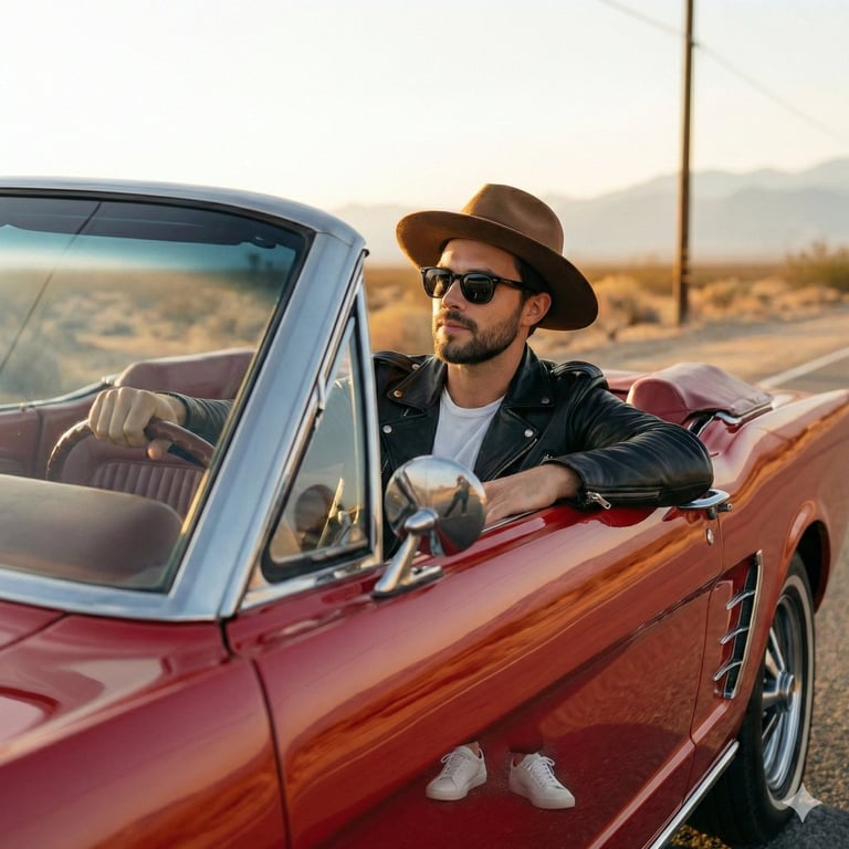 A JSON prompt for a cinematic fashion portrait with a retro Americana mood. It features a male subject leaning against a classic red vintage convertible on an isolated desert highway during golden hour, emphasizing DSLR realism, shallow depth of field, and muted cinematic film tones.