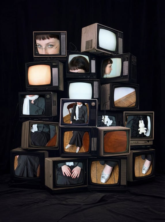 A prompt for generating a moody, retro, cinematic image featuring a stack of vintage CRT TVs in a dark room. Each screen displays a different cropped detail (profile, eyes, outfit) of a girl from a reference photo, with analog distortion, scanlines, and the TVs serving as the main, glowing light source.