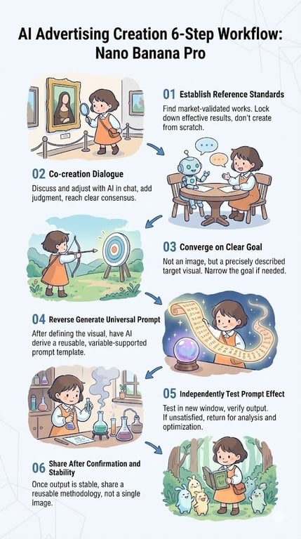 A meta-prompting process description (step 4) that instructs the AI to reverse-engineer a reusable prompt template based on a clearly defined visual goal. This template must support custom variables for long-term use in advertising creation.