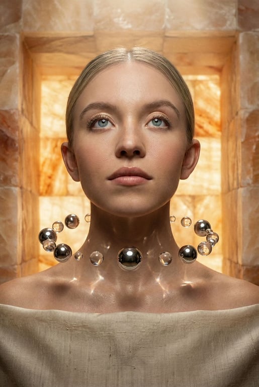 A complex, hyper-realistic prompt for a surreal beauty portrait with an 'Ancient Alchemy' theme. It specifies a tight head-and-shoulders composition, a levitating orbital collar of liquid mercury and water droplets, alabaster setting, and specific analog photography technical details (Hasselblad, Kodak Portra simulation).