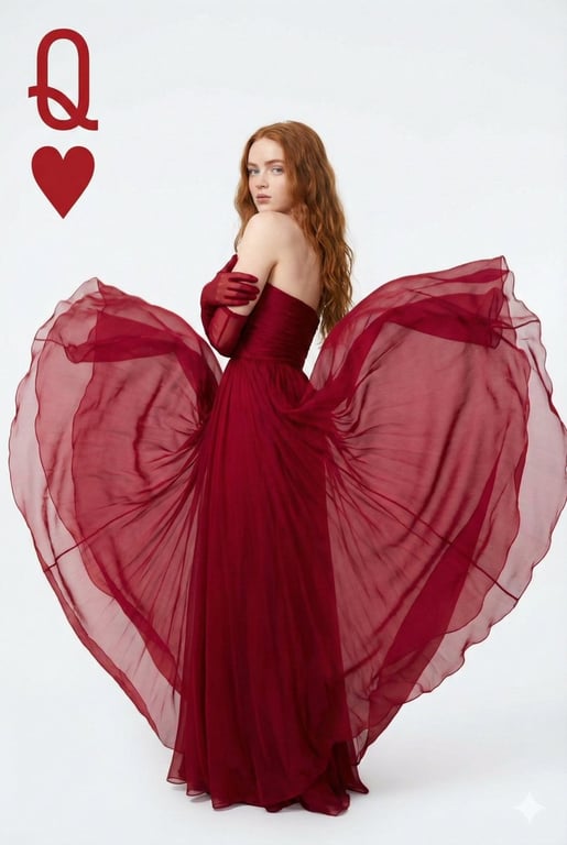 A high-fidelity prompt requiring strict facial replication of the subject (Sadia Sink) while applying a high-concept fashion studio portrait style. The theme is 'Queen of Hearts', featuring a deep crimson strapless gown and massive layers of sheer red chiffon sculpted into a perfect heart shape behind the subject.