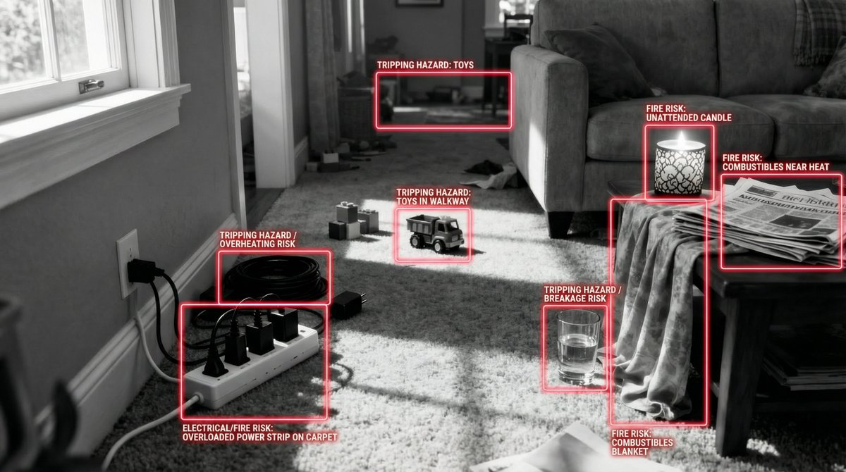 A prompt designed for an AI capable of image analysis and re-generation. It asks the AI to analyze a provided image for specific safety hazards (fire, tripping, electrical), regenerate the room in black and white, and overlay bright neon red bounding boxes and text labels identifying each risk found.