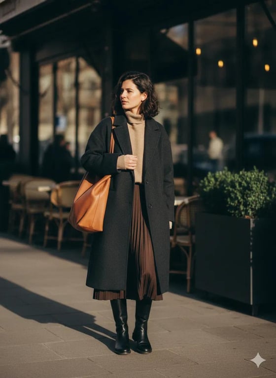 A prompt designed to generate an editorial street portrait in the style of Scott Schuman (The Sartorialist), capturing a woman mid-walk on a city sidewalk with a natural, unposed expression, focusing on daylight realism and minimalist fashion.