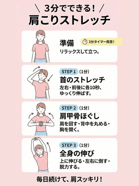 A prompt for generating a 3:4 minimal illustration infographic about a simple three-minute stretch to relieve shoulder stiffness, featuring a female model.