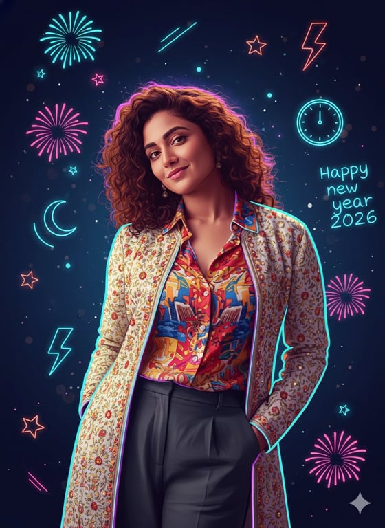A complex prompt for generating a dark neon doodle vector illustration of a single person in a 'sigma' pose, strictly preserving the facial identity from an uploaded image, and integrating glowing New Year 2026 elements with a controlled bloom effect.