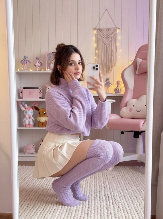 A highly detailed, structured prompt for Nano Banana 2, generating an ultra-photorealistic mirror selfie of a female subject in a Sylveon-inspired casual trainer cosplay (lavender sweater and mini skirt), performing a deep crouching squat pose in a professional gaming room with soft, dreamy pastel lighting.