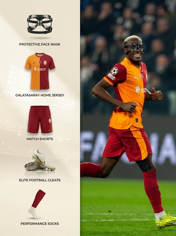 A complex JSON prompt for creating a 3:4 vertical sports equipment breakdown infographic layout featuring Victor Osimhen. The left panel displays product images (mask, jersey, cleats) on a premium ivory background, while the right panel shows an authentic smartphone photograph of Osimhen celebrating a goal.