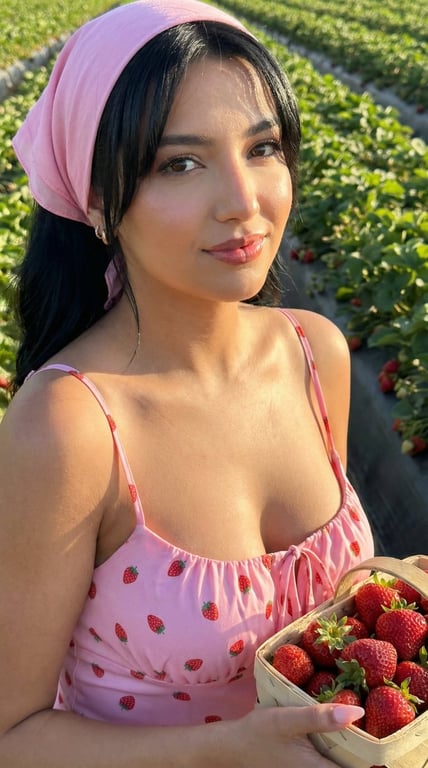 A highly detailed JSON prompt for generating a photorealistic, high-fashion editorial portrait of a woman in a strawberry print dress in a strawberry field, focusing on the subtle detail of strawberry juice glossing her lips.