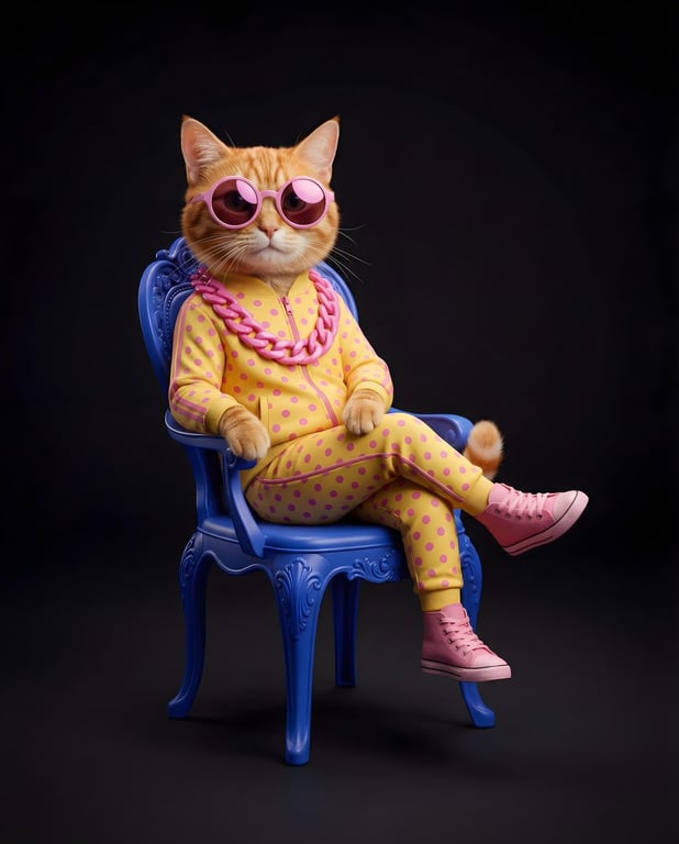A prompt for generating an image of a stylish anthropomorphic cat wearing a fitted yellow tracksuit with pink polka dots, chunky pink accessories, and pink high-top sneakers. The cat is sitting on a sleek cobalt blue modern chair, emphasized by dramatic studio lighting against a seamless black background.