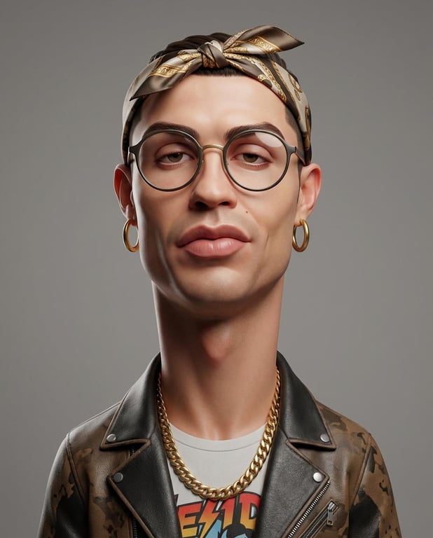 A detailed prompt for creating an exaggerated, stylized 3D caricature portrait based on a reference photo, requiring intentional deformation (oversized head, heavy lips) while preserving facial likeness, rendered with clean materials and neutral studio lighting for a weird, fashion-forward aesthetic.