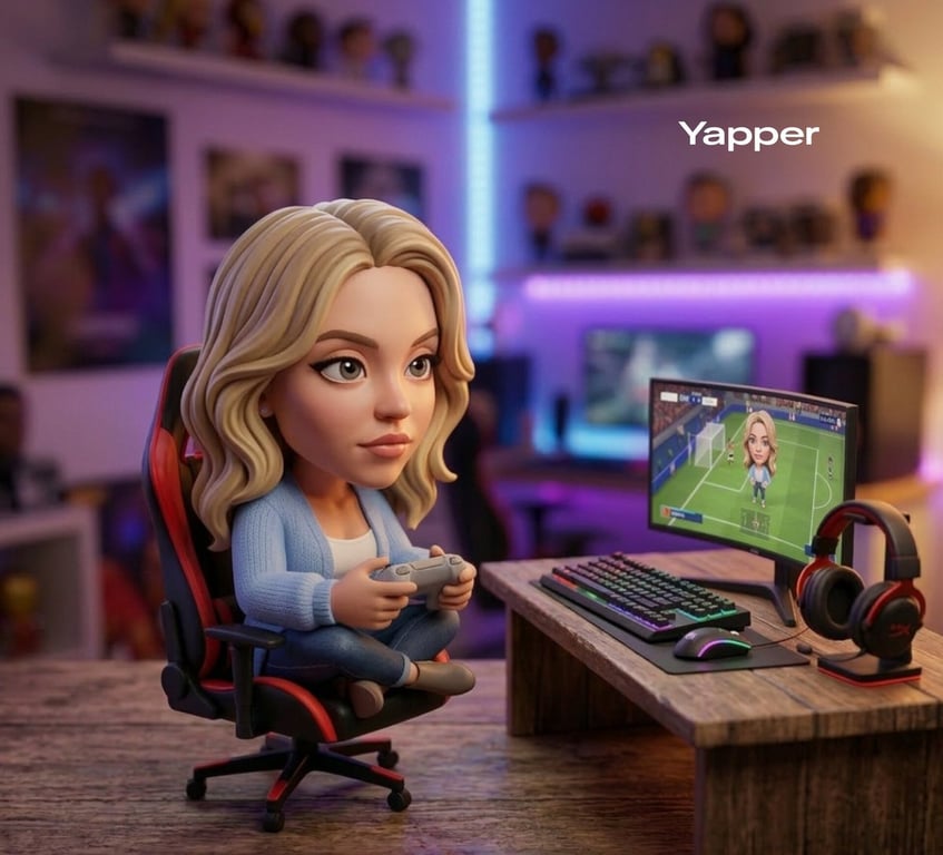 A prompt for generating a cute, stylized 3D collectible figurine of a football star, sitting in a gaming chair with a small gaming setup, rendered in a Pixar-style with glossy finish and cinematic lighting.