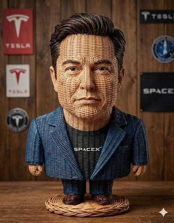 A prompt for generating a highly detailed, photorealistic image of a stylized caricature figurine made entirely from woven wicker/rattan material, emphasizing hyper-realistic texture, studio lighting, and artistic craftsmanship.