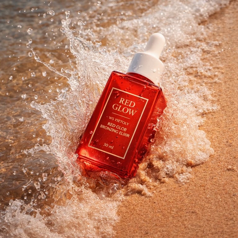 A detailed prompt for generating an AI-edited photorealistic product photograph of a cosmetic serum dropper bottle lying on a sandy beach shoreline. The prompt specifies the environment (wet, compacted sand, sea foam), the product details (red glass bottle, gold text), and the lighting (bright but soft natural sunlight) for a high-contrast, warm-toned summer aesthetic.