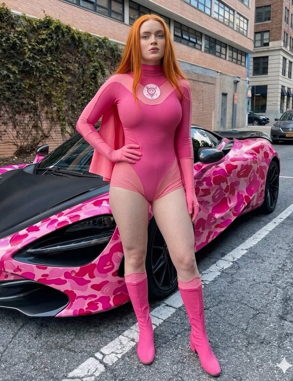 The second of two prompts for generating a full-body photorealistic image of a woman in a pink superhero bodysuit posing elegantly while sitting on the hood of a pink camouflage sports car, maintaining a high-fashion, cinematic feel.