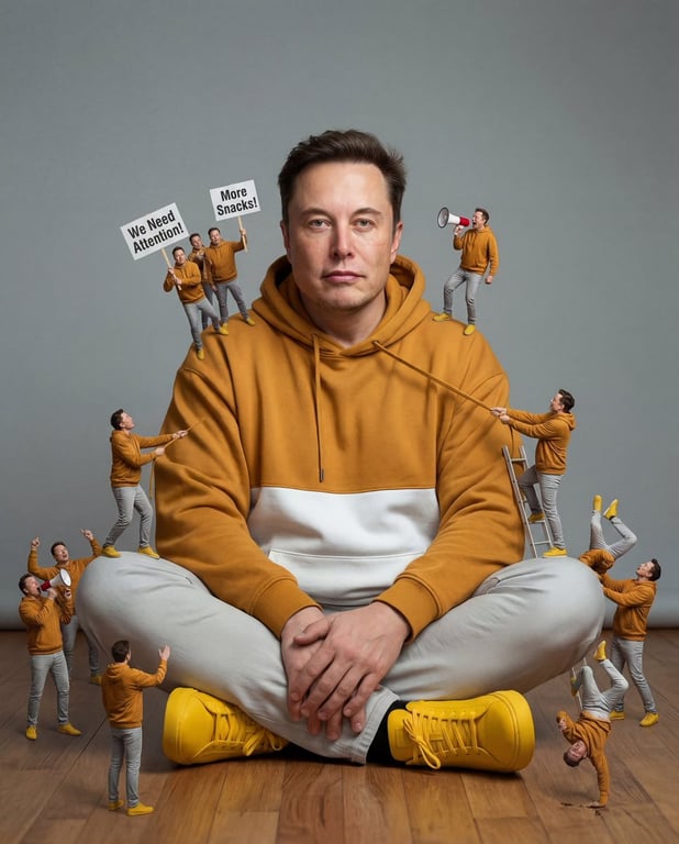 A prompt for Gemini Nano Banana 2 to generate an ultra-realistic, hyper-detailed surreal comedy portrait of a man (identical to a reference photo) sitting cross-legged, surrounded by dozens of chaotic miniature versions of himself holding protest signs and engaging in humorous activities. The prompt specifies cinematic quality, 8K resolution, and a 9:16 aspect ratio.