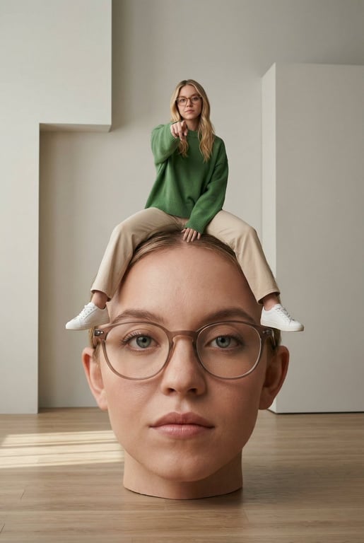 A prompt for generating a surreal conceptual art photograph featuring scale distortion. The subject is sitting on an oversized, realistic human head in a minimalist modern interior. It requires using a reference image for the exact face and identity of both the body and the oversized head, emphasizing ultra-realistic textures and a modern art vibe.
