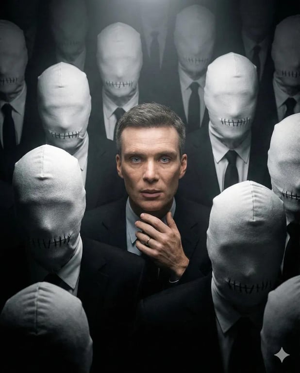 A prompt for generating a surreal, moody conceptual portrait using an uploaded face as a strict identity reference. The subject is isolated by a single overhead spotlight and surrounded by a claustrophobic crowd of anonymous figures wearing black formal clothing and white fabric hoods, symbolizing enforced silence and dystopian conformity, rendered with harsh chiaroscuro lighting and 35mm film aesthetic.