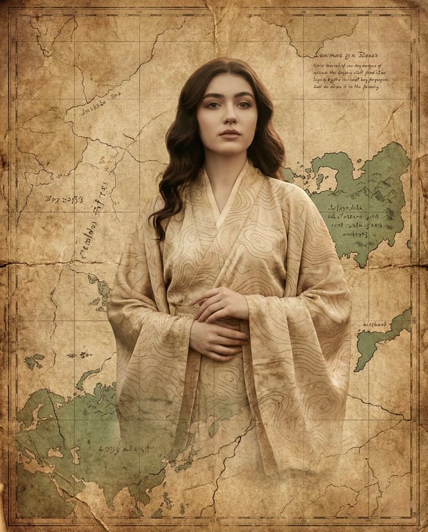 A highly detailed prompt for generating a surreal, fine-art portrait of a young woman with East Asian features. The core concept is that the woman seamlessly emerges from an ancient parchment map, with her clothing and hair blending into the map's texture and topography. It emphasizes preserving the exact facial identity from a reference image and maintaining a nostalgic, sepia-toned, museum-quality aesthetic.