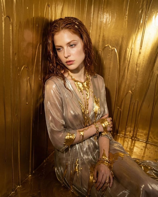 A complex JSON prompt for Nano Banana Pro to create a surreal high-fashion editorial portrait titled 'Molten Opulence.' The subject is immersed in a practical-effect environment of flowing, viscous liquid gold. The prompt demands a severe Vertigo Dutch Angle, harsh directional lighting, and Kodak Ektar 100 film texture to avoid a CGI look and emphasize vulnerability amidst opulence.
