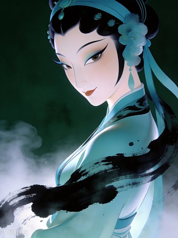 A user shares a detailed Chinese prompt aiming for a surreal Oriental aesthetic, blending the ink wash style of Shanghai Animation Film Studio (ä¸ç¾å½±) with 3D volumetric light. The prompt describes an abstractly deformed figure of a woman in green robes, focusing on facial close-up, detailed textures, and a specific color palette.