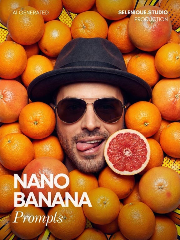 A prompt for generating a luxury fashion editorial portrait with a surreal pop-art twist. It features a man's face emerging from a dense composition of ripe oranges and grapefruits, wearing a fedora and sunglasses, with a playful expression. The style emphasizes saturated citrus colors, clean studio lighting, and strong visual humor.
