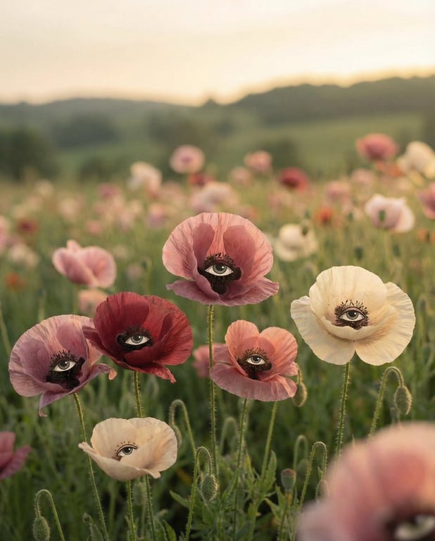 A prompt for generating a surreal, dreamlike image of a field of poppies where each flower has an eye in its center, with the flowers facing the viewer against a blurred greenery background.