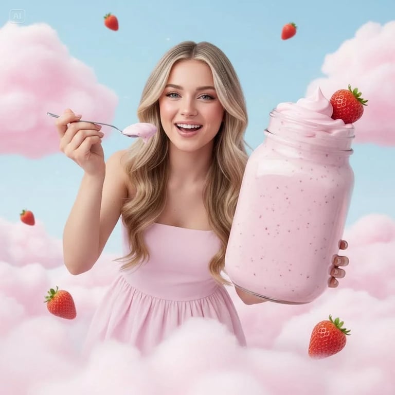 A detailed prompt for generating a surreal, whimsical, kawaii-aesthetic advertisement image featuring a large strawberry yogurt smoothie jar floating in a cotton candy cloudscape, alongside a beautiful young woman model. This prompt explicitly requires using a reference image for the model's face.