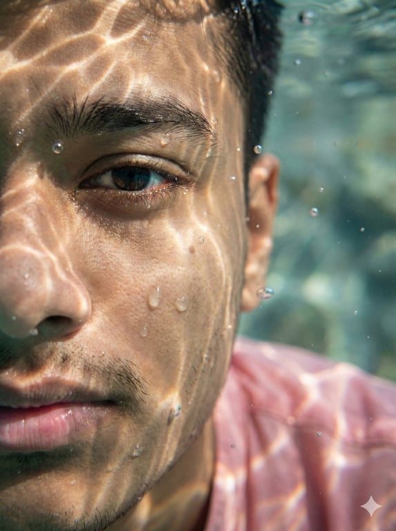 A prompt designed for generating a hyper-realistic, surreal close-up portrait. It focuses on the left half of a face submerged in water, emphasizing macro details like skin pores and wet textures, cinematic lighting with caustic patterns, and a dreamlike atmosphere with a shallow depth of field.