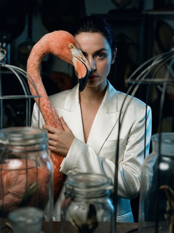 A highly detailed, structured JSON prompt for generating a surrealist fashion editorial image titled 'Surrealist Ornithology.' The prompt specifies a voyeuristic, long-lens capture of a model in a taxidermy atelier, holding an oversized flamingo head prop to create a 'split-face' illusion, emphasizing analog photographic texture and moody chiaroscuro lighting.