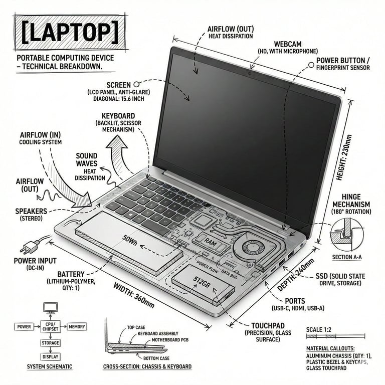 A prompt for generating a technical infographic image of a laptop, combining a photorealistic render with black ink-style line drawings and annotations (labels, measurements, flow arrows) on a pure white background, creating an engineering-manual aesthetic.