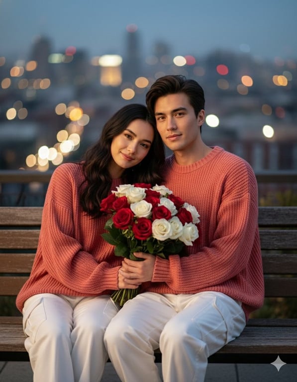 A set of three detailed prompts designed for Valentine's Day themed cinematic couple photoshoots, requiring face matching from a reference image, covering scenes like a romantic city park at dusk, a serene seaside boat deck, and an intimate night festival with fireworks.