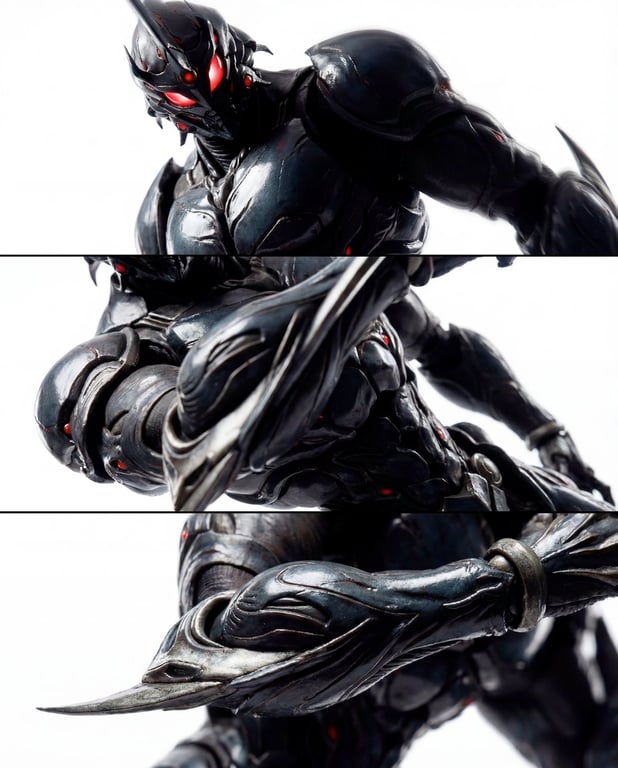 A complex, multi-panel prompt designed to generate a vertical triptych (three stacked images) of the same high-gloss, sculpted subject. The prompt dictates escalating intimacy and intensity through extreme close-up camera techniques (low angle, macro, canted angle, selective blur) to create a dynamic, abstract fashion editorial look without relying on environment or props.