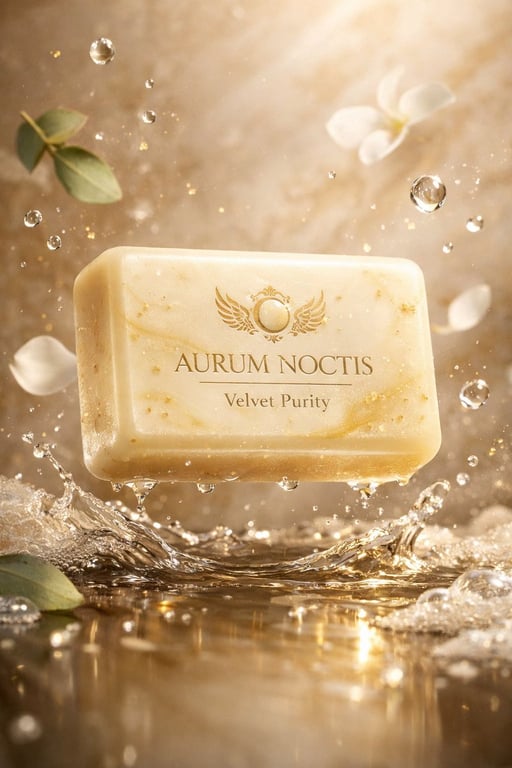 A highly detailed JSON prompt for GPT Image 1.5 and Google Nano Banana Pro to generate an ultra-cinematic, hyper-realistic commercial render of a luxury artisan soap bar. The prompt specifies the product details (ivory base, gold swirls, engraved crest), composition (floating bar, suspended water droplets), lighting (soft spa-inspired golden glow), and extreme macro-level detail and material physics.