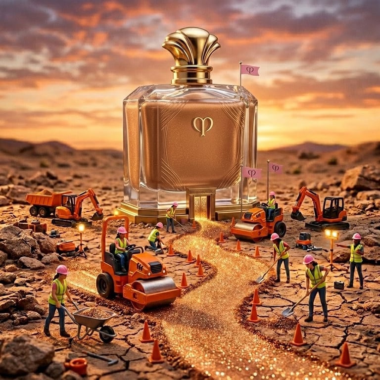 A highly detailed prompt for generating an image styled as a luxury product advertisement, featuring a miniature construction scene around a large foundation bottle. The prompt specifies composition, lighting (golden hour), and macro photography style for hyper-realistic results.